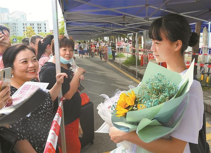 家長帶著鮮花來到寶安中學(xué)考場門口迎接考生。深圳商報(bào)記者陳錫明攝