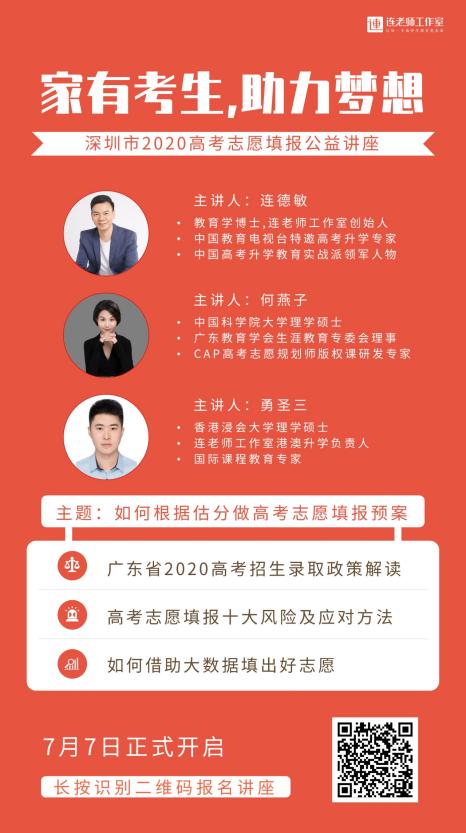 作為此次深圳市2020高考志愿填報公益講座的主辦方,連老師工作室負責人連德敏博士聯(lián)合海內(nèi)外著名教育學者和業(yè)內(nèi)知名高考升學教育專家,在生涯視角、以“人”優(yōu)先和實戰(zhàn)派三大核心理念下,聚焦于我國高中階段生涯規(guī)劃教育、高考升學規(guī)劃、新高考選科、學業(yè)規(guī)劃的教育研究與咨詢服務,為廣大家長、學生提供高品質(zhì)高中生涯與升學規(guī)劃整體解決方案。