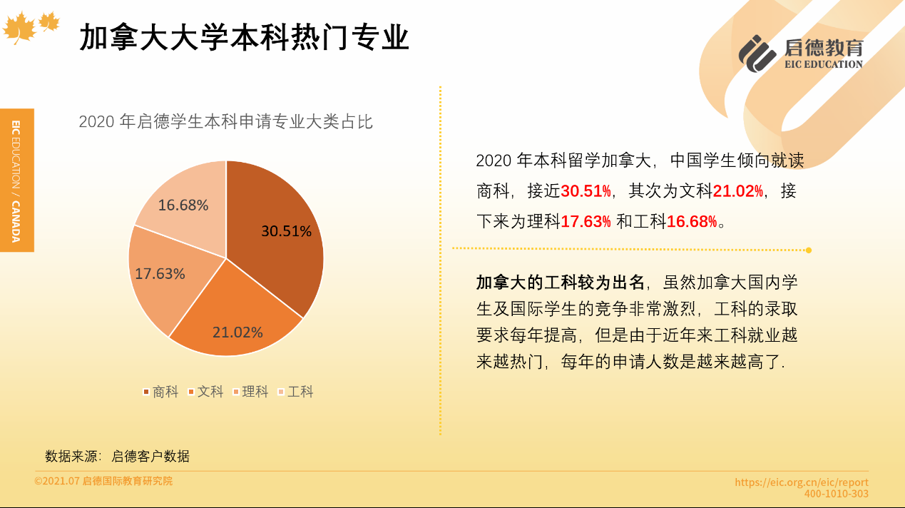 啟德留學客戶服務數(shù)據(jù)顯示,2020年加拿大本科階段,理工科專業(yè)占比34.31%,商科占比30.51%,文科21.02%,理工科的申請人數(shù)超過了商科。碩士階段選擇最多的專業(yè)是計算機工程(17.13% )、 MBA (9.99% )、金融(9.44% )與教育學(7.94% ),其他碩士熱門專業(yè)還有經(jīng)濟學、會計、數(shù)據(jù)科學、機械與能源工程、商業(yè)分析等。