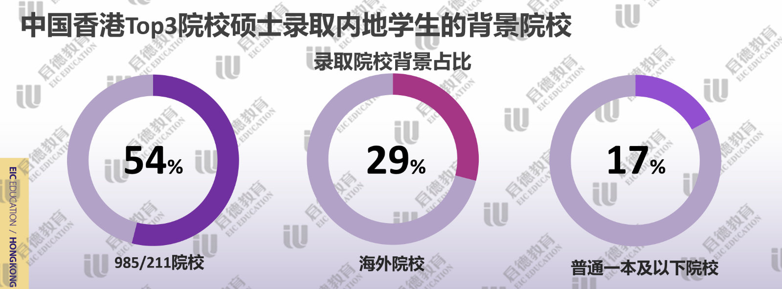 申請香港高校提交雅思成績較多,啟德留學(xué)2021客戶服務(wù)數(shù)據(jù)顯示,近3成錄取學(xué)生雅思成績達(dá)到7分或以上,主要集中在金融、會計(jì)、傳媒、英語教育等熱門專業(yè);雅思達(dá)到6.5分占比幾乎一半,代表了香港高校錄取學(xué)生的平均水平;雅思6分占比不到四分之一,主要分布于理工科或冷門專業(yè)。香港TOP3名校(香港大學(xué)、香港科技大學(xué)、香港中文大學(xué))錄取的碩士學(xué)生中,985/211院校背景的學(xué)生超過了一半;因疫情因素導(dǎo)致海外留學(xué)生的回流,近30%的碩士學(xué)生來自于海外院校本科;雙非院校的占比僅為17%,集中于需要豐富實(shí)習(xí)和工作經(jīng)驗(yàn)的理工科。擁有實(shí)習(xí)/科研等經(jīng)歷占比為99%,其中,超八成學(xué)生完成了3次以上的實(shí)習(xí)/科研。