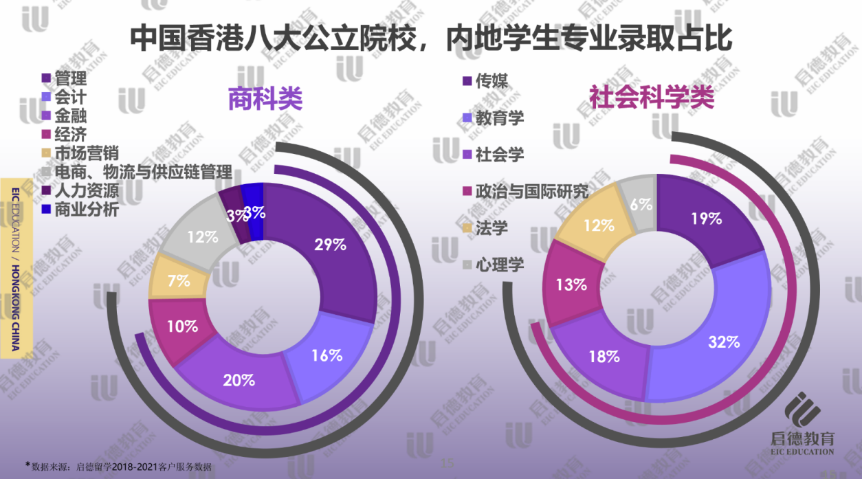 啟德留學(xué)2018-2021客戶服務(wù)數(shù)據(jù)顯示,香港高校商科方向的錄取學(xué)生比例占絕對優(yōu)勢(39% ),社會科學(xué)類專業(yè)居次 (30% ),由于粵港澳地區(qū)高科技產(chǎn)業(yè)就業(yè)機(jī)會多,港??蒲袑?shí)力強(qiáng)勁,工程技術(shù)類專業(yè)錄取占比 (17% )也較為可觀。在商科的細(xì)分專業(yè)中,管理專業(yè)是首選(29% ),這與港校各種管理類專業(yè)選擇較多且錄取難度相對偏低有一定的關(guān)聯(lián)性。金融(20% )、會計(jì)(16% )和經(jīng)濟(jì)學(xué)(10% )專業(yè)注重培養(yǎng)學(xué)生的思維以及分析能力,多被授予理學(xué)碩士學(xué)位,畢業(yè)生在香港地區(qū)很受歡迎。背景一般,特別是來不及準(zhǔn)備GMAT的申請人,可以嘗試申請經(jīng)濟(jì)學(xué),增加入讀港校商科核心專業(yè)的機(jī)率。受內(nèi)地電商及周邊行業(yè)的快速發(fā)展的影響,電商、物流與供應(yīng)鏈管理類(12% )成為近年新晉的熱門專業(yè)。