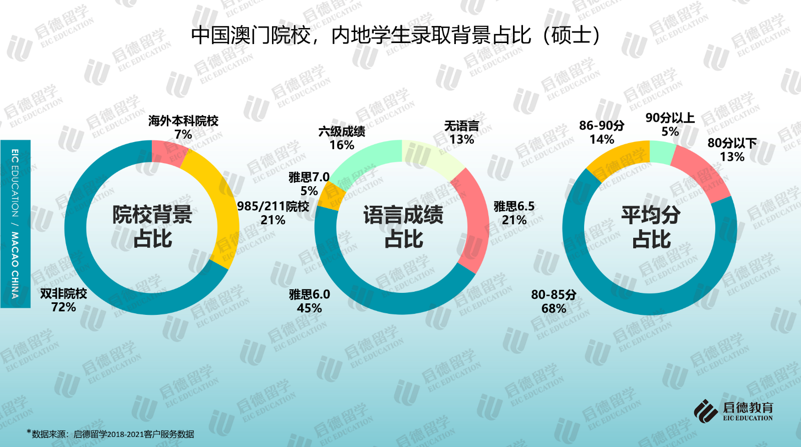 本科錄取中,澳門大學(xué)的要求較高,應(yīng)屆高考生申請(qǐng)人高考成績(jī)要達(dá)到一本線;碩士錄取中,只有澳門大學(xué)和澳門旅游學(xué)院要求碩士申請(qǐng)學(xué)生提交英語(yǔ)成績(jī),雅思6分為澳門大學(xué)和澳門旅游學(xué)院的語(yǔ)言門檻要求,澳門大學(xué)碩士申請(qǐng)也可接受430分以上六級(jí)和TEM4/8成績(jī);其它院校的大多數(shù)專業(yè)對(duì)英語(yǔ)成績(jī)無(wú)硬性要求。啟德留學(xué)2018-2021客戶服務(wù)數(shù)據(jù)顯示,2021年碩士錄取學(xué)生中,45%達(dá)到雅思6分的門檻成績(jī),雅思成績(jī)6.5分以上達(dá)到26%,16%的學(xué)生只提供了合格的六級(jí)成績(jī),13%為無(wú)語(yǔ)言錄??;七成以上的碩士錄取學(xué)生來(lái)自雙非院校;GPA在80分以上的占比為87%。