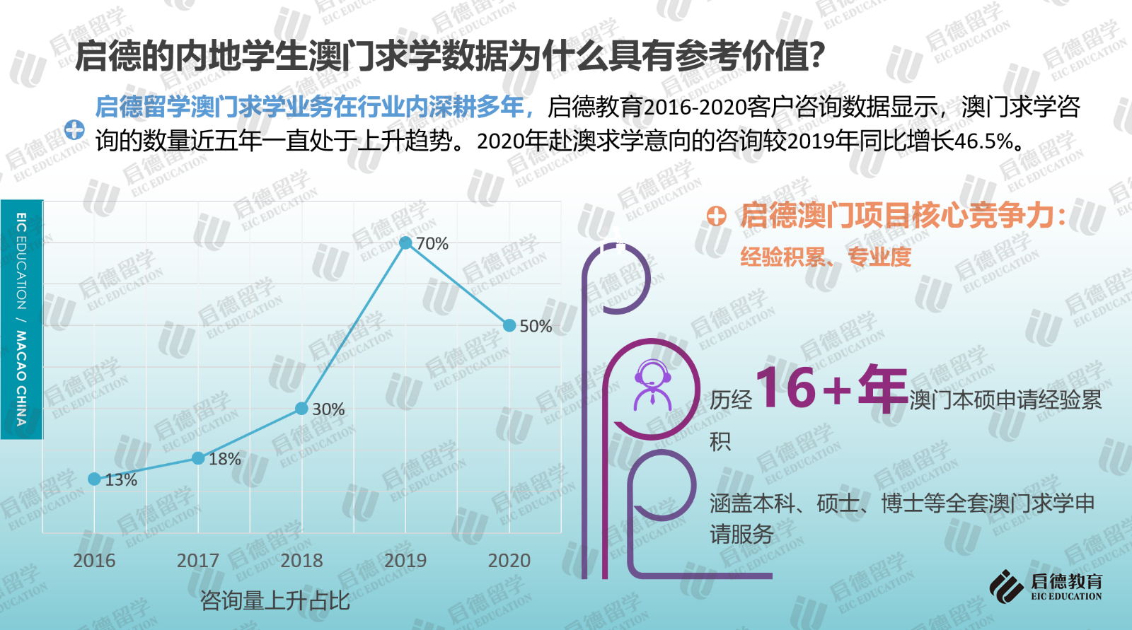 啟德留學(xué)2016-2020客戶服務(wù)數(shù)據(jù)顯示,澳門求學(xué)咨詢量近五年一直處于上升趨勢(shì),2020年咨詢量較2019年同比增長(zhǎng)46.5%。2021年10月31日,啟德留學(xué)在北京發(fā)布《2021中國(guó)澳門求學(xué)報(bào)告》,這也是行業(yè)內(nèi)首次針對(duì)中國(guó)內(nèi)地學(xué)生赴澳門求學(xué)情況進(jìn)行的梳理與分析,《報(bào)告》結(jié)合澳門高校官方數(shù)據(jù)及最近四年啟德學(xué)生澳門求學(xué)申請(qǐng)與錄取數(shù)據(jù),重點(diǎn)分析了澳門求學(xué)的申請(qǐng)要求與錄取趨勢(shì)、澳門六大高校的特色與優(yōu)勢(shì)專業(yè)、澳門本地就業(yè)情況,并就赴澳門求學(xué)規(guī)劃、申請(qǐng)準(zhǔn)備及求職就業(yè)等方面提供了建議。