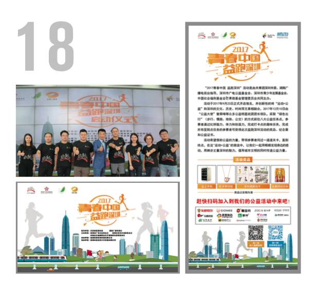 由深圳市廣電公益基金會、深圳市青少年發(fā)展基金會等主辦,深圳棠果影視傳媒有限公司承辦?!?017青春中國益跑深圳”活動作為創(chuàng)意公益募捐慈善活動,通過招募深圳市民自愿以“綠色出行”(步行、慢跑、地鐵、公交)的方式完成城市穿越,從而為10個社會慈善項目進行募捐的大型公益活動。