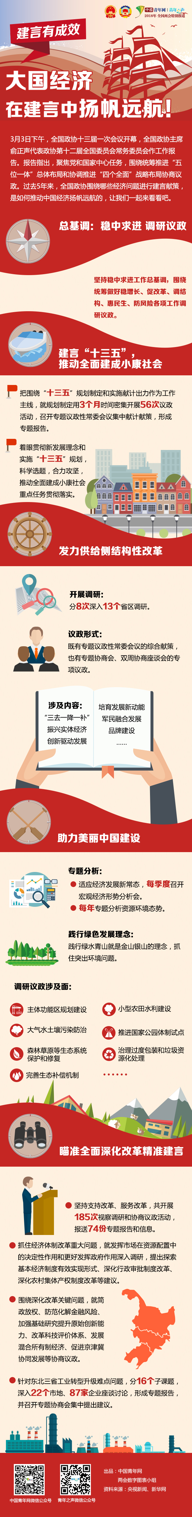 中國青年網(wǎng)北京3月4日電 3月3日下午,全國政協(xié)十三屆一次會(huì)議開幕,全國政協(xié)主席俞正聲代表政協(xié)第十二屆全國委員會(huì)常務(wù)委員會(huì)作工作報(bào)告。報(bào)告指出,聚焦黨和國家中心任務(wù),圍繞統(tǒng)籌推進(jìn)“五位一體”總體布局和協(xié)調(diào)推進(jìn)“四個(gè)全面”戰(zhàn)略布局協(xié)商議政。過去5年來,全國政協(xié)圍繞哪些經(jīng)濟(jì)問題進(jìn)行建言獻(xiàn)策,是如何推動(dòng)中國經(jīng)濟(jì)揚(yáng)帆遠(yuǎn)航的,讓我們一起來看看吧。