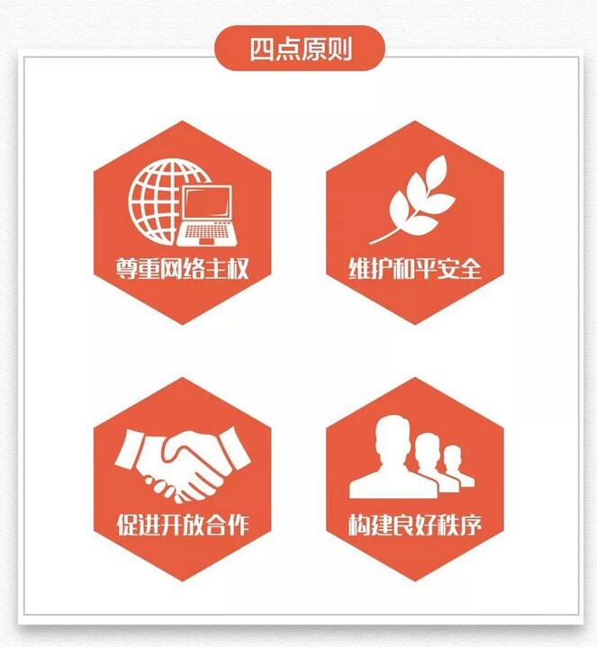 習(xí)近平曾指出,互聯(lián)網(wǎng)發(fā)展是無(wú)國(guó)界、無(wú)邊界的,利用好、發(fā)展好、治理好互聯(lián)網(wǎng)必須深化網(wǎng)絡(luò)空間國(guó)際合作,攜手構(gòu)建網(wǎng)絡(luò)空間命運(yùn)共同體。要理直氣壯維護(hù)我國(guó)網(wǎng)絡(luò)空間主權(quán),明確宣示我們的主張。為此,習(xí)近平提出“四點(diǎn)原則”和“五點(diǎn)主張”: