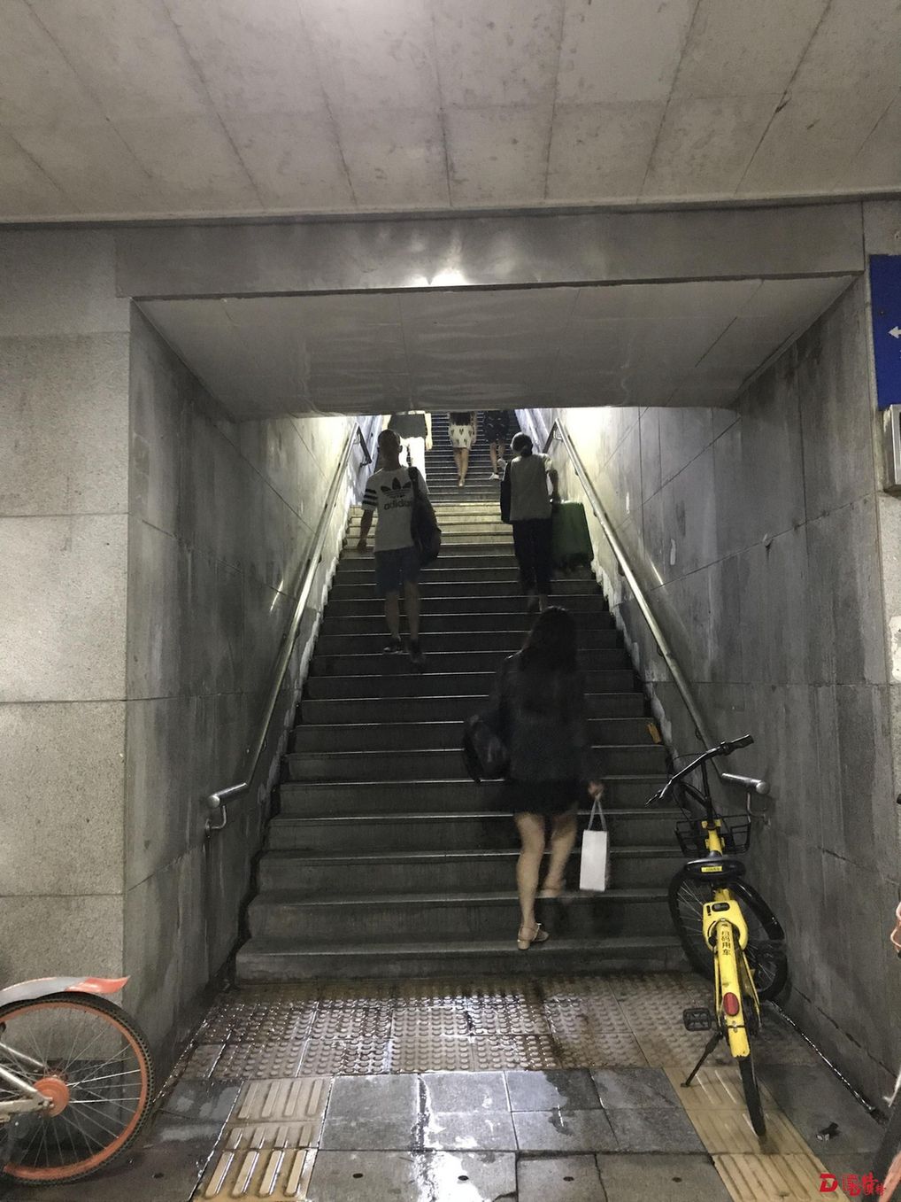 深南大道東門過街通道,雨天漏水,地板破損,臺階沒有坡道,行李箱與自行車得靠人扛