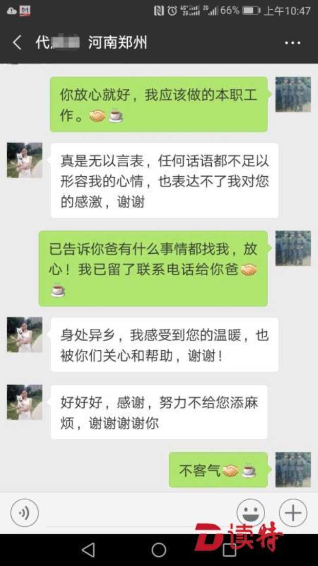 早上7時(shí)50分許,口岸派出所巡邏民警陳譚海終于在火車站廣場(chǎng)外的小店中找到了老人,隨即將其接到派出所,隨后由口岸派出所民警晏紅衛(wèi)將其送到轄區(qū)濱河中學(xué)的緊急避難所予以妥善安置,目前老人的身體健康狀況良好,并與其女兒代女士取得了聯(lián)系。