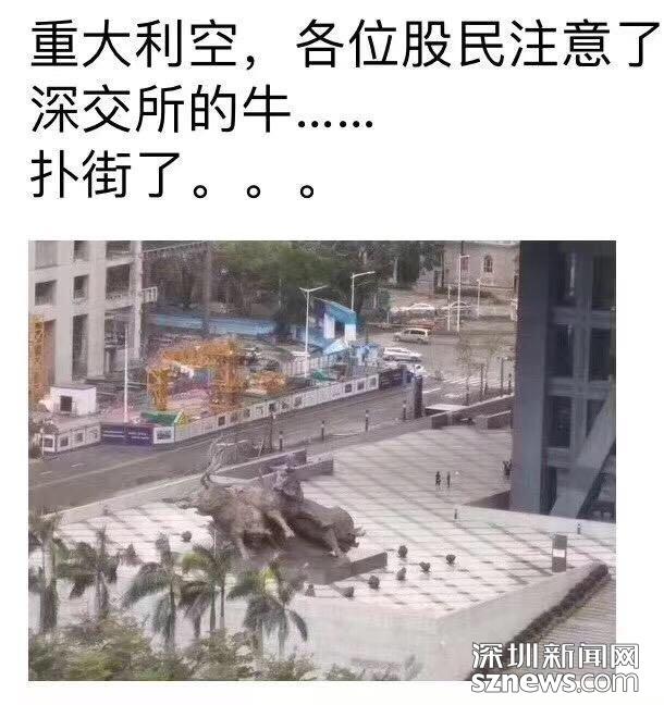深圳新聞網(wǎng)9月18日訊(記者 張玲 實習生歐陽子瑜 張林羽 陸宇)關(guān)于“山竹”的各種段子特別多,博君一笑,未必是真。記者18日發(fā)現(xiàn),有一張像素極低的圖在網(wǎng)上流傳,照片中一頭牛雕塑臥倒在地,配文是:重大利空,各位股民注意了,深交所的牛,撲街了……