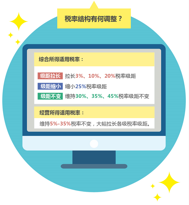 在稅率表的調(diào)整上,此次改革將更多地惠及中低收入群體,對勞動性所得,以現(xiàn)行工薪所得3%-45%七級超額累進(jìn)稅率為基礎(chǔ),拉大3%、10%、20%三檔低稅率的級距,對經(jīng)營性所得,在維持現(xiàn)行5%-35%五級超額累進(jìn)稅率的基礎(chǔ)上,也適當(dāng)擴(kuò)大了各檔次稅率級距,減輕了廣大經(jīng)營業(yè)主的稅負(fù)。