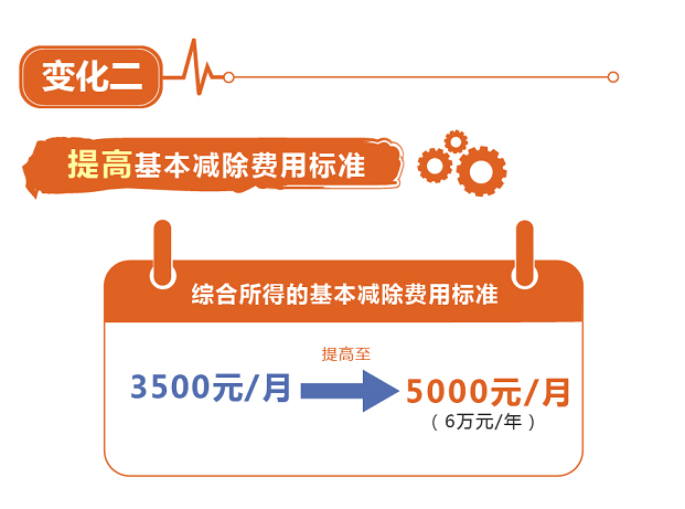 此次個稅改革再次提高基本減除費用標(biāo)準(zhǔn)和優(yōu)化稅率結(jié)構(gòu)。從今年10月1日起,基本減除費用標(biāo)準(zhǔn),也就是俗稱的起征點,將從原來每人每月3500元提高至5000元(每人每年6萬元)。