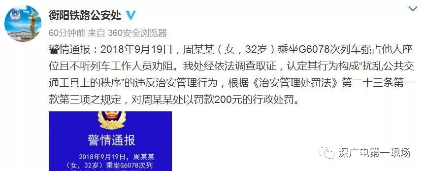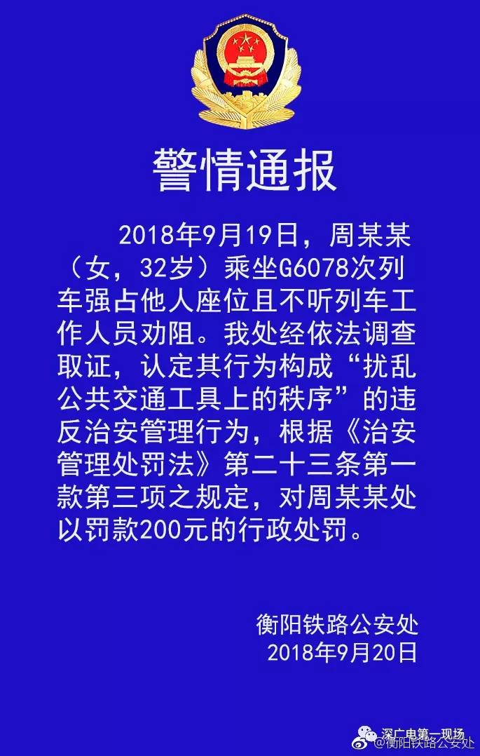 今天上午10點多,@衡陽鐵路公安處發(fā)布警情通報稱,2018年9月19日,周某某(女,32歲)乘坐G6078次列車強占他人座位且不聽列車工作人員勸阻。