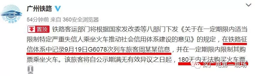 據(jù)@廣州鐵路今天上午10點25分通報稱,鐵路客運部門將根據(jù)國家發(fā)改委等八部門下發(fā)《關(guān)于在一定期限內(nèi)適當限制特定嚴重失信人乘坐火車推動社會信用體系建設(shè)的意見》的規(guī)定,在鐵路征信體系中記錄9月19日G6078次列車旅客周某某信息,并在一定期限內(nèi)限制其購票乘坐火車。
