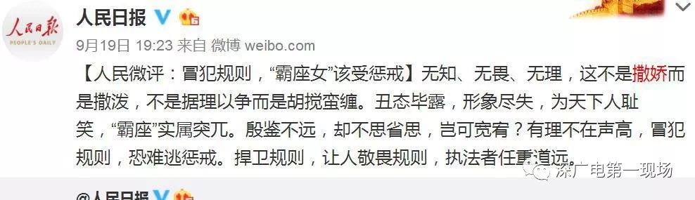 對此,@人民日報官方微博昨晚發(fā)表評論【冒犯規(guī)則,“霸座女”該受懲戒】:無知、無畏、無理,這不是撒嬌而是撒潑,不是據(jù)理以爭而是胡攪蠻纏。丑態(tài)畢露,形象盡失,為天下人恥笑,“霸座”實屬突兀。殷鑒不遠,卻不思省思,豈可寬宥?有理不在聲高,冒犯規(guī)則,恐難逃懲戒。捍衛(wèi)規(guī)則,讓人敬畏規(guī)則,執(zhí)法者任重道遠。