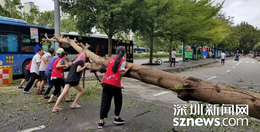 9月16日上午,蛇口街道南水社區(qū)黨委書記、婦聯(lián)主席李淑文,冒著可能被樹倒塌木砸傷的危險,浸泡在沒膝的雨水中幾個小時清理臺風(fēng)刮落路面的樹枝,讓來往車輛順利通行。