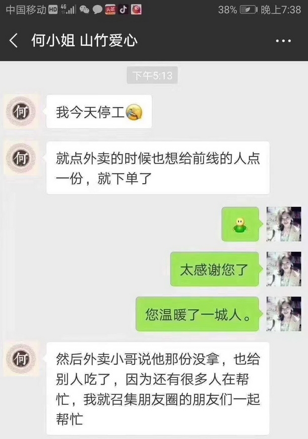 還有為這些前線工人送愛心外賣訂單的“何女士”