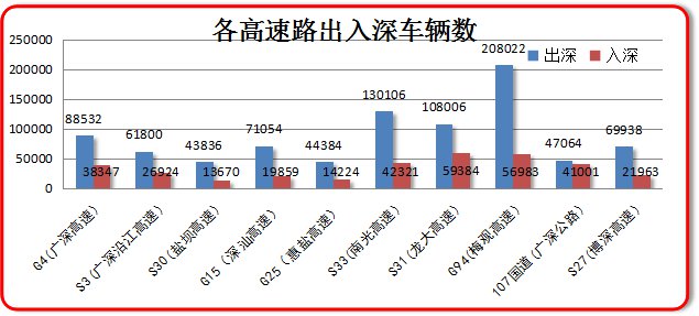 從車輛的流向看,由深圳東部出深(深汕、惠鹽、博深、惠深沿海)的車輛約21.99萬輛;由東部入深約8.3萬輛。由深圳中部出深(梅觀 -莞深)的車輛約20.8萬輛;由中部入深約5.7萬輛。由深圳西部出深(107國道、廣深、沿江、南光 -龍大)的車輛約44.48萬輛;由西部入深約19.47萬輛。