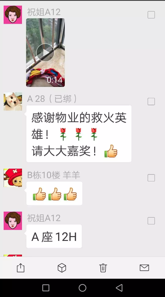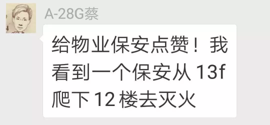 ▲業(yè)主在微信群紛紛點(diǎn)贊物業(yè)救火英雄。