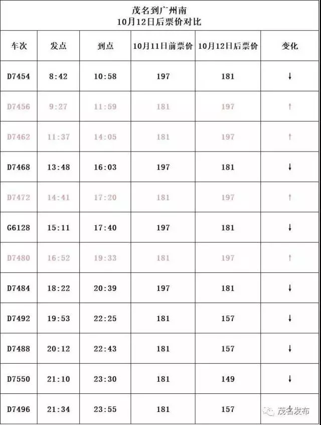 D7451次(7點(diǎn)10分班次)由原來的206元調(diào)整為196元;