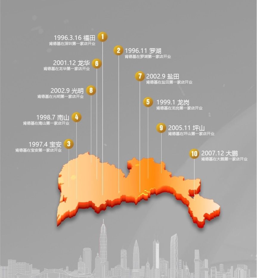 2007年,是深圳的大年份,也是肯德基的大年份。2007年,深圳人均GDP達(dá)到10684美元,首次超過(guò)1萬(wàn)美元??系禄拈_(kāi)店數(shù)量也在那一年突破了100家,達(dá)到108家。同時(shí),肯德基完成了對(duì)現(xiàn)在深圳十區(qū)的開(kāi)店布局。
