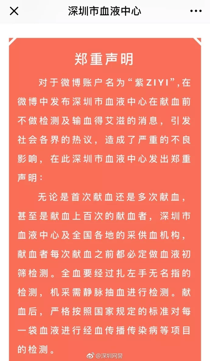 @深圳市血液中心發(fā)出鄭重聲明:無論是首次獻血者還是多次甚至是上百次的獻血者,每次獻血都必須做初篩檢測,全血要經(jīng)過扎左手無名指的檢測,機采需靜脈抽血進行檢測。獻血后,嚴格按照國家規(guī)定的標準對每一袋血液進行經(jīng)血傳播傳染病等項目的檢測。