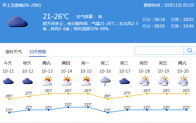 受弱冷空氣影響,預(yù)計(jì)11~12日有分散小雨,其中11日氣溫20 ℃ ~27 ℃。12日持續(xù)陰天,有分散陣雨,氣溫21 ℃ ~27 ℃。預(yù)計(jì)此次弱冷空氣影響持續(xù)到周末,13~15日晴天到多云,氣溫開始回升。16日將有新一輪冷空氣進(jìn)入深圳,有一次降雨過(guò)程。