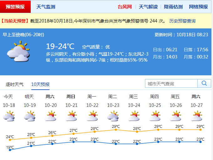 市內(nèi)吹2-3級東北風,沿海和高地偏東陣風6-7級。大部分地區(qū)能見度較好,在8-15公里。雨時能見度較低,出行注意安全。最小相對濕度在80%左右,最大相對濕度在90%左右。