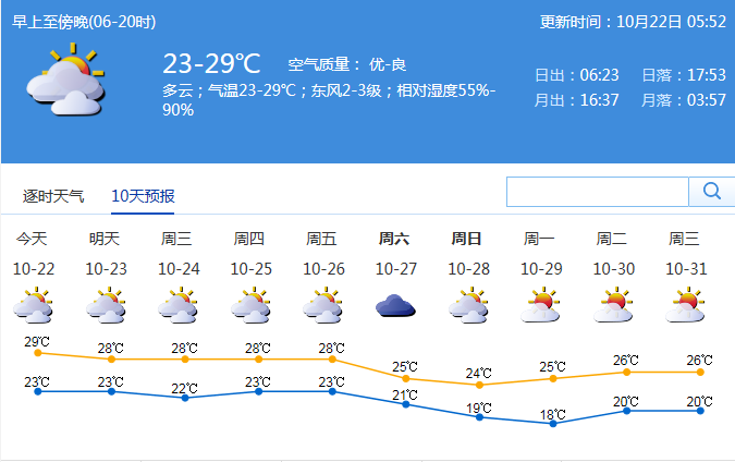 深圳新聞網(wǎng)訊 進入10月中旬,西太平洋上的臺風們終于“安靜”下來,冷空氣逐漸成為接下來的主角,我國北方城市也紛紛步入秋季。盡管全市在10月11日早晨全市最低氣溫普遍在20℃左右,但距真正入秋還有一定距離。據(jù)市氣象局預測,22日至26日我市大致多云,間中有小雨,最低氣溫22-24℃,最高氣溫27-29℃。