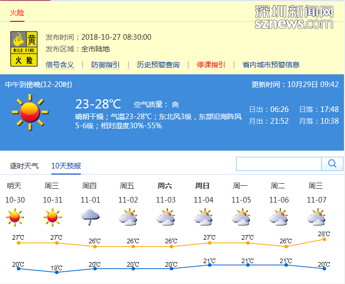 記者從深圳市氣象局了解到,29日,深圳市晴朗干燥;氣溫在20-28℃;東北風(fēng)3級,陣風(fēng)5-6級;相對濕度30%-70%。火險預(yù)警信號生效中。