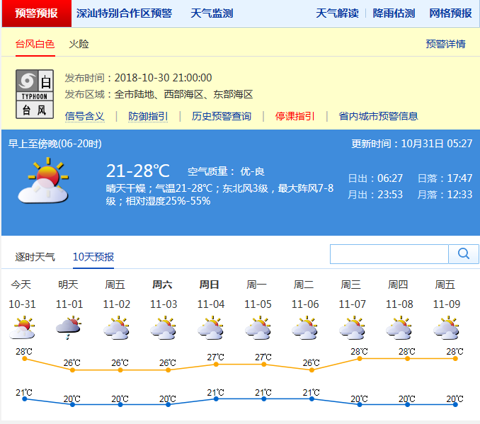 【深圳天氣趨勢】1日沿海和高地平均風(fēng)6級、最大陣風(fēng)8-9級,并伴有陣雨;2日風(fēng)力逐漸減弱;3-6日多云,氣溫回升。 今年第26號臺風(fēng)“玉兔”(強(qiáng)熱帶風(fēng)暴級)31日02時(shí)位于距離我市約788公里的南海海面上,預(yù)計(jì)將繼續(xù)偏西北行,1日轉(zhuǎn)向偏北至東北方向移動,強(qiáng)度明顯減弱。 深圳市氣象臺2018-10-31 05:27:00發(fā)布。