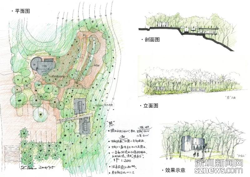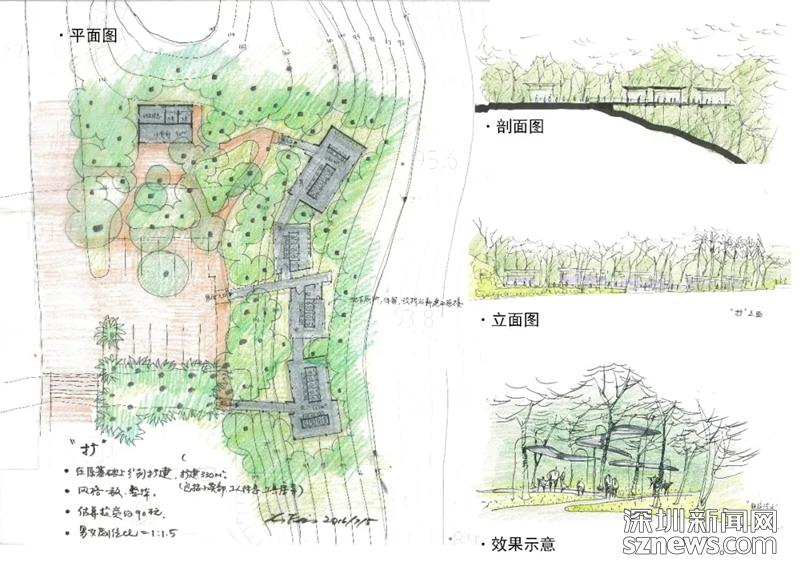 費(fèi)曉華在文中提到,“隨著深圳人口和游客的劇增,蓮花山頂公共廁所已不堪負(fù)重,急需擴(kuò)大規(guī)模。2016年,本人受蓮花山公園管理處的邀請,免費(fèi)為他們提供了改擴(kuò)建方案。方案共有兩種思路:‘隱擴(kuò)’和‘顯擴(kuò)’,均是在保留原建筑的基礎(chǔ)上,擴(kuò)大使用面積以滿足更多人的需求。從更好地保護(hù)自然環(huán)境的角度出發(fā),本人推薦‘隱擴(kuò)’方案。” (附設(shè)計(jì)圖)