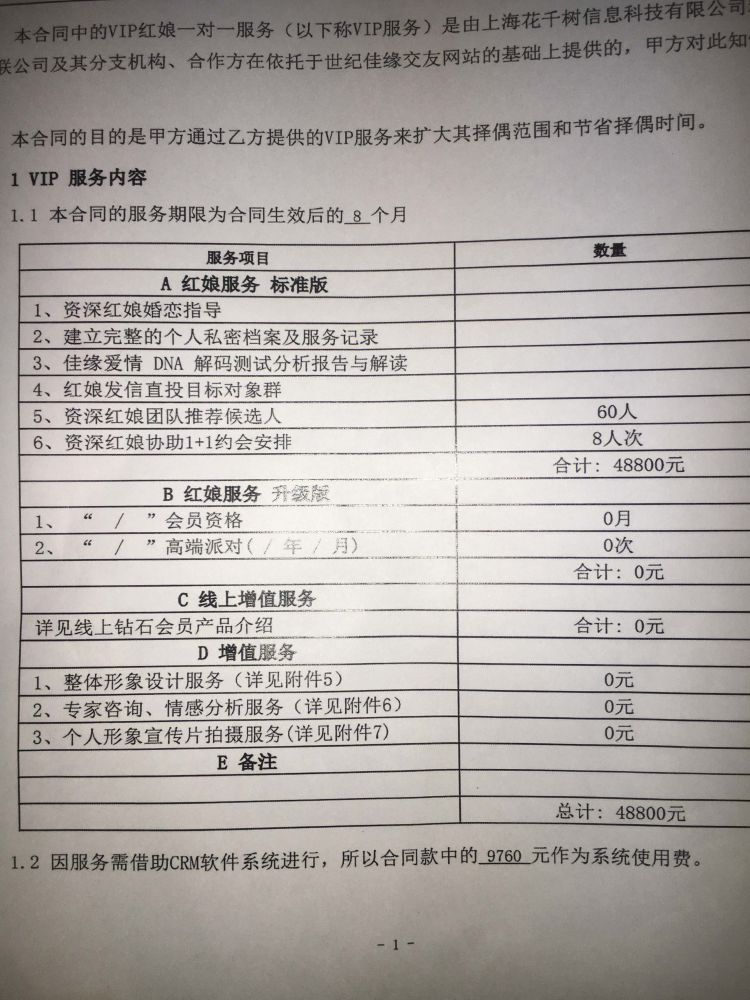 今年2月27日,劉小姐與世紀(jì)佳緣簽訂了一份繳款4.88萬的紅娘服務(wù)合同。合同服務(wù)期限為8個(gè)月,合同將根據(jù)其擇偶標(biāo)準(zhǔn),由系統(tǒng)推薦60位候選人,其中紅娘協(xié)助線下約會(huì)安排8人次。此外,合同還包含三項(xiàng)增值服務(wù),包括整體形象設(shè)計(jì),專家咨詢、情感分析服務(wù)和個(gè)人宣傳片服務(wù)。