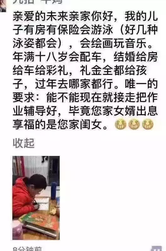 這兩天刷爆朋友圈的一種特殊的文體在朋友圈火了起來,這些文章都是寫給未來的親家的,文章開頭先是對自家娃大力夸獎(jiǎng)一番,什么有房有車、會(huì)游泳、婚禮豪配等要素,一個(gè)都不落下;文章的最后提出唯一的要求,那就是把娃現(xiàn)在就接走。這些文章充分顯示了家長在輔導(dǎo)自己孩子做作業(yè)的時(shí)候,心情不太舒暢。