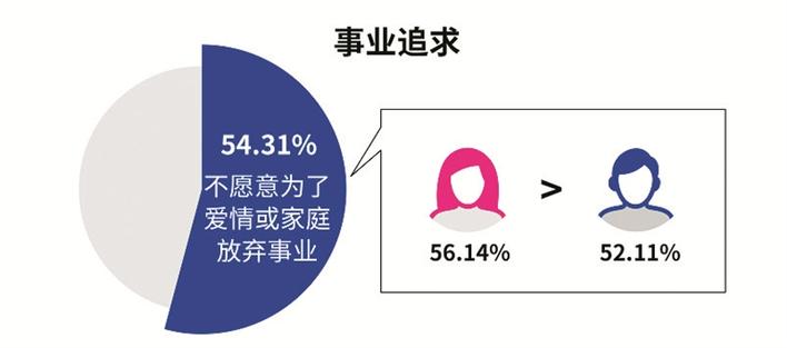 對于許多人而言,愛情和事業(yè)沖突的抉擇已經(jīng)越來越常見。調(diào)查顯示,54.31%的單身男女不愿意為了愛情或家庭放棄自己的事業(yè)。從男女差異看,56.14%的女性表示不愿意為了愛情或家庭放棄自己的職場或事業(yè),高于男性??梢姡詫τ谑聵I(yè)的追求正在逐漸提升。