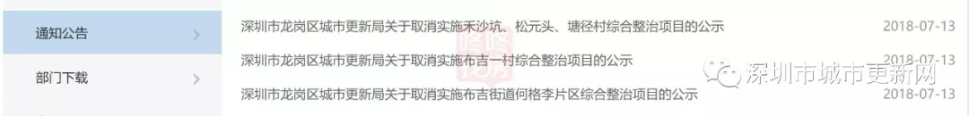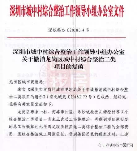 事實上,早在2018年7月,龍崗區(qū)城市更新局就已經(jīng)依據(jù)相關(guān)規(guī)定要求,批復取消這幾個城中村實施綜合整治的申請,并予以公示。此次的批復公告實際為區(qū)城市更新局向上級城中村綜合整治領(lǐng)導和決策機構(gòu)(深城整辦)的請示文件所反饋的意見復函。