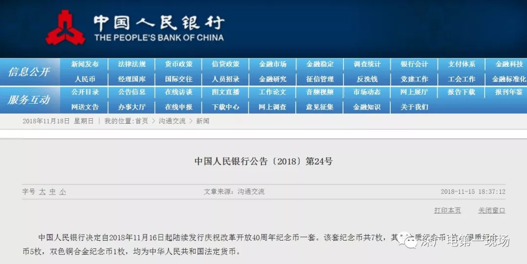 中國(guó)人民銀行決定自2018年11月16日起陸續(xù)發(fā)行慶祝改革開放40周年紀(jì)念幣一套。該套紀(jì)念幣共7枚,其中金質(zhì)紀(jì)念幣1枚,銀質(zhì)紀(jì)念幣5枚,雙色銅合金紀(jì)念幣1枚,均為中華人民共和國(guó)法定貨幣。面額分別分100元、50元、10元。
