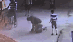 將小月按倒在地后,一名成年男子對著孩子的頭部打了五拳,看到圍觀市民越來越多,男子帶著身邊的男孩離開。
