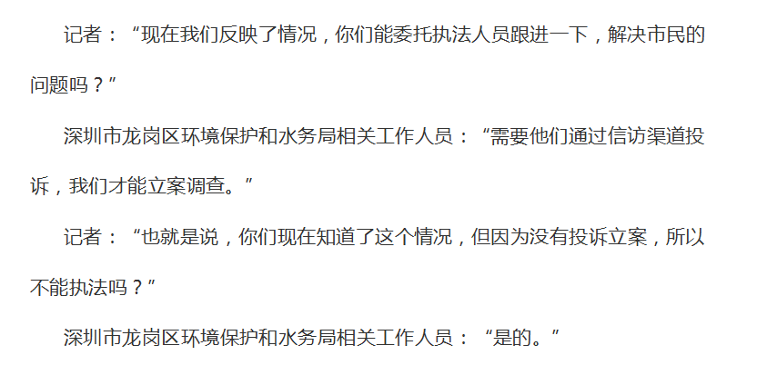 以下是記者與深圳市龍崗區(qū)環(huán)境保護和水務局信訪部門工作人員的部分對話: