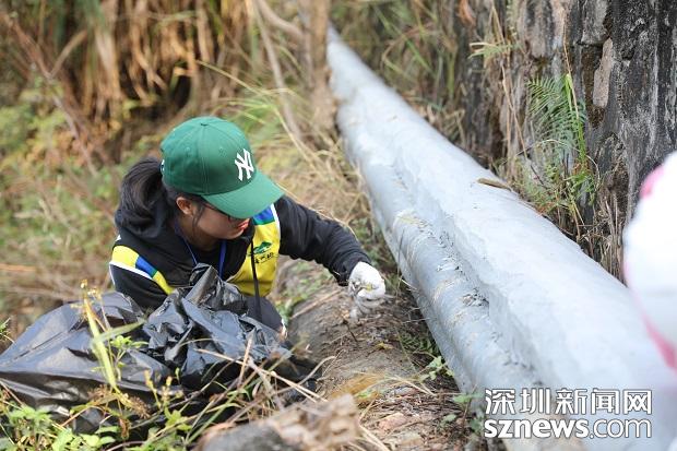 志愿者在懸崖邊拾取管道下的垃圾