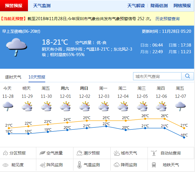 深圳市氣象局預(yù)計,29日零星小雨轉(zhuǎn)多云,可見陽光;30日到12月1日陰天間多云,偶有零星小雨;2到3日,多云,可見陽光。