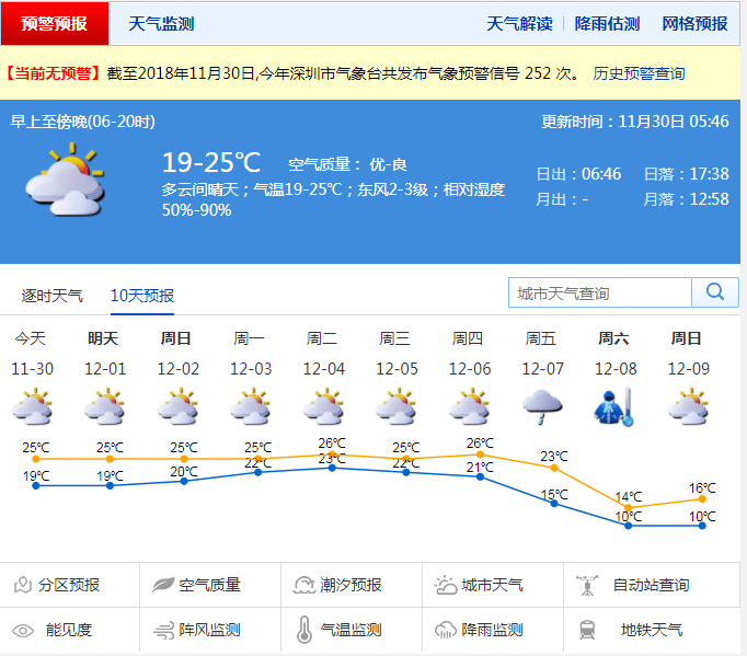 深圳新聞網(wǎng)11月30日訊(記者 施冰冰)29日多云間晴天;18-25℃;東風(fēng)2-3級(jí);濕度50%-90%。12月1-2日多云可見陽(yáng)光,早晚有輕霧;3-6日多云間陰天,偶有零星小雨。展望7-8日,受冷空氣影響,北風(fēng)明顯增大,天氣轉(zhuǎn)冷。
