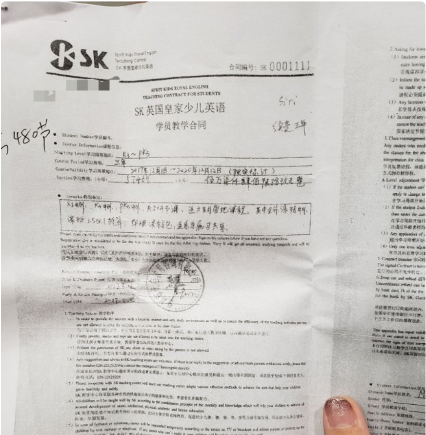 12月2日,家住福田區(qū)的徐先生照常把孩子帶到香蜜湖1979文化創(chuàng)意園的"SK英國皇家少兒英語"上課,沒想到到了課堂卻收到一紙停課通知。工作人員告訴徐先生,由于經(jīng)營不善,機(jī)構(gòu)老板決定停止授課,家長們要提供當(dāng)初簽訂的合同和收據(jù)辦理退款,但是在2018年3月1日前交學(xué)費(fèi)的家長不能退款。