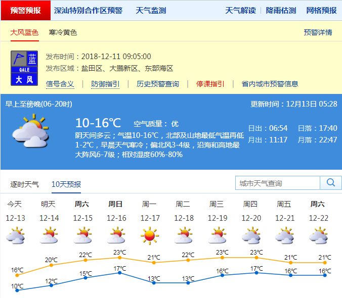 深圳新聞網(wǎng)2018年12月13日訊(記者 施冰冰)記者從深圳市氣象局獲悉,今日天氣寒冷:1多云間陰天,可見陽光,沿海和高地最大陣風(fēng)6級(jí),氣溫11-17℃,北部及山地最低氣溫略低1℃,白天比12日溫暖;14-16日多云,可見陽光,氣溫逐日回升;寒冷黃色預(yù)警將持續(xù)到今日,14日起氣溫回升。