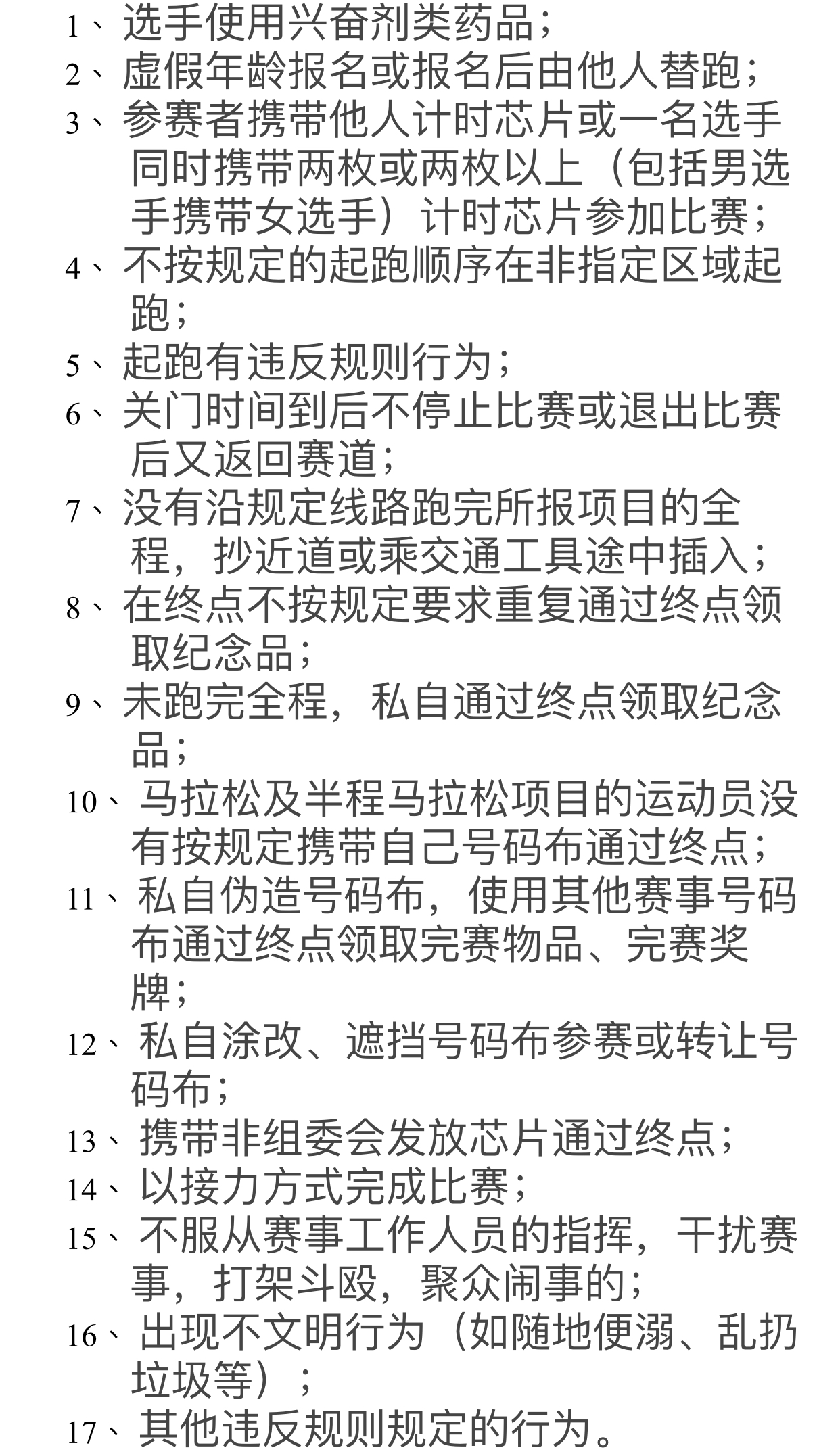 據(jù)悉,在比賽期間選手出現(xiàn)17項(xiàng)違規(guī)行為之一的問題,裁判員有權(quán)中止選手的比賽并當(dāng)場沒收違規(guī)選手的號(hào)碼布及芯片,取消其比賽資格,賽后由組委會(huì)視情節(jié)輕重分別給予參賽選手取消2018深馬比賽成績、禁賽1至2年,情節(jié)嚴(yán)重者終身禁賽等處罰,并將違規(guī)信息報(bào)送中國田協(xié)申請(qǐng)系列追加處罰。
