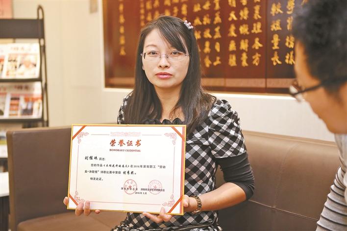 “近期,我剛剛加入了深圳市福田區(qū)作家協(xié)會?!眲⒐鹬楦嬖V記者,她從高中的時候就喜歡寫作。“后來,我來深圳打工之后,不管工作多忙多累,這個愛好都沒有間斷過,一直堅持到現在。它已經成為我生命中的一部分了,可以說是一種生活習慣。”