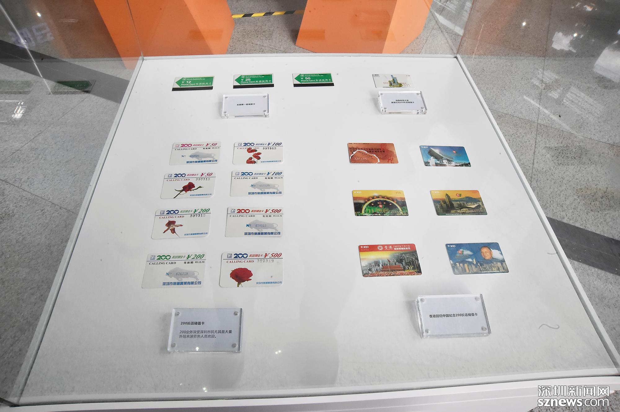卡類專區(qū)分別展示了全國第一套綠箭卡(左上),信息樞紐大廈奠基紀念200長話儲值卡(右上),200長話儲值卡(左下)以及香港回歸中國紀念200長話儲值卡(右下)。