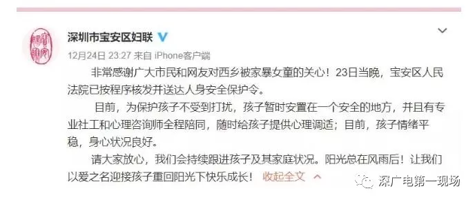 而在稍早前的12月24號,寶安西鄉(xiāng)街道辦發(fā)布的情況通報(bào):寶安區(qū)人民法院于23號晚已經(jīng)簽發(fā)人身安全保護(hù)令,目前已經(jīng)送達(dá)當(dāng)事人及轄區(qū)派出所。