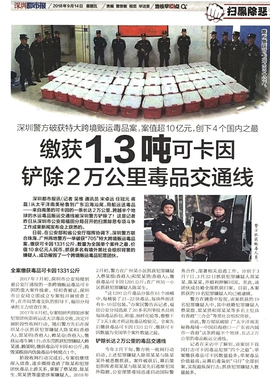 ★★在公安部和省公安廳指揮協(xié)調(diào)下,福田警方作為主力軍,聯(lián)合珠海、廣州兩地警方一舉破獲“705”特大跨境販運(yùn)毒品案,創(chuàng)下我國打擊可卡因毒品犯罪“四個之最”:單案繳獲毒品可卡因數(shù)量最多;單案毒品價值最高;從幕后毒梟到“馬仔”全部到案,實(shí)現(xiàn)最縱深打擊;抓獲犯罪嫌疑人數(shù)量最多。