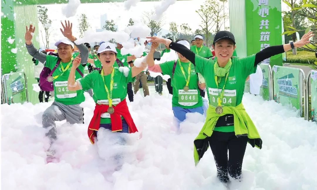 南山街道2018環(huán)鏟灣渠-桂廟渠生態(tài)歡樂跑全長5公里,共設置2個環(huán)保生態(tài)泡泡點、1個團隊任務挑戰(zhàn)游戲點、4個生態(tài)環(huán)保勛章打卡點,并設有南山街道精品特色社區(qū)黨建和生態(tài)環(huán)保建設的知識闖關答題環(huán)節(jié)。參與者到達終點,完成全部闖關任務之后可以領取一枚生態(tài)環(huán)保勛章。位于終點主會場的“充氣桌球”、“超級投籃”、“一飛沖天”、“超級扣籃”生態(tài)環(huán)保嘉年華游戲區(qū)域,更是讓全體跑友陷入了歡樂的海洋。起點、中途和終點都設有環(huán)境保護和精品特色社區(qū)創(chuàng)建的宣傳展板,多方位展示南山街道在河渠治理和精品特色社區(qū)建設方面做出的成績。