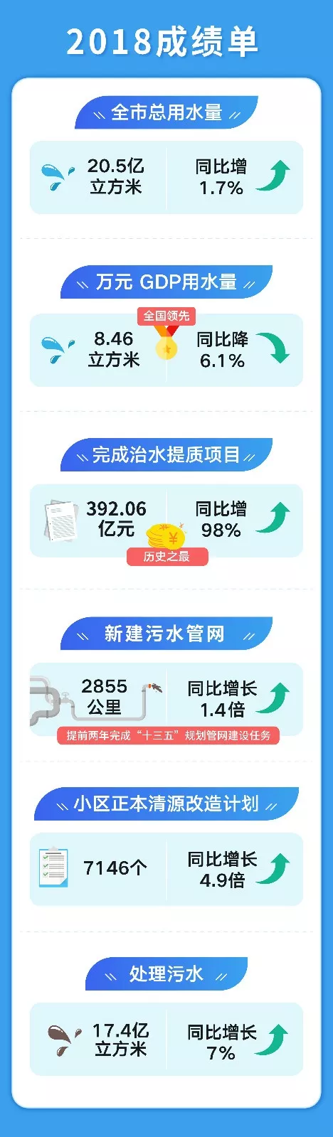 水資源保障能力持續(xù)加強(qiáng)!全市自來(lái)水水質(zhì)綜合合格率保持在99.9%!我們完成優(yōu)質(zhì)飲用水入戶(hù)工程小區(qū)312個(gè)和120個(gè)供水管網(wǎng)改造工程社區(qū),創(chuàng)建311個(gè)優(yōu)質(zhì)飲用水達(dá)標(biāo)小區(qū)。